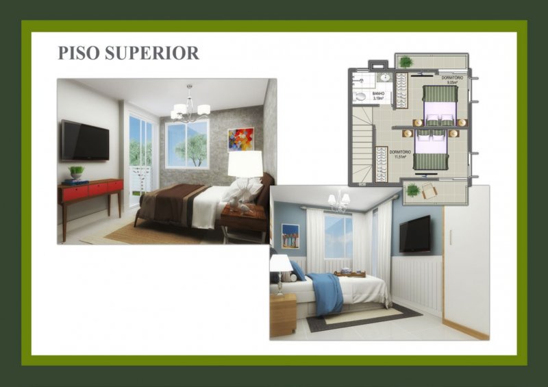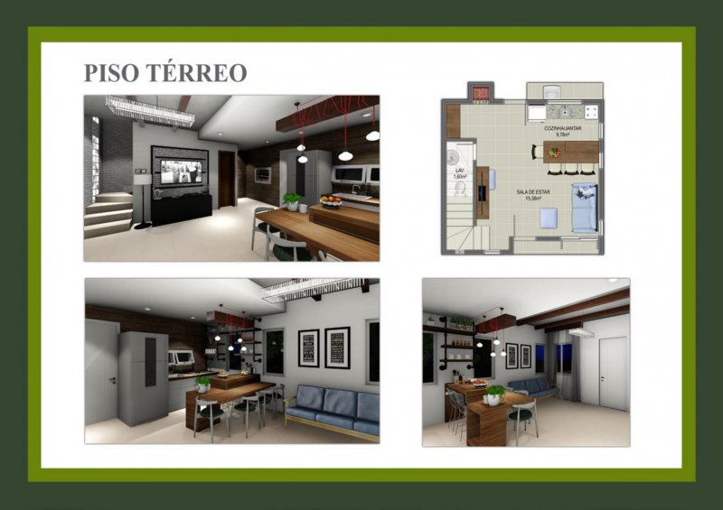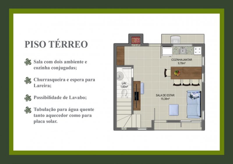 No piso térreo, as casas possuem sala com dois ambientes e cozinha conjugadas, proporcionando integração entre os espaços.