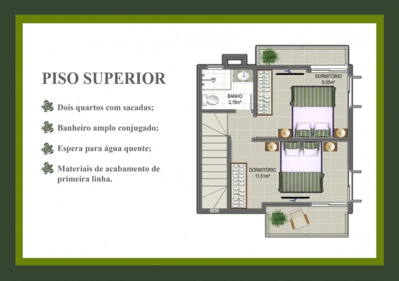 O piso superior das casas conta com dois quartos com sacadas, permitindo que os moradores desfrutem de um espaço reservado para relaxar ao ar livre.