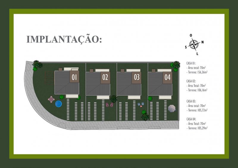 As casas contam com recuos laterais, proporcionando mais privacidade entre as unidades, cada casa possui um jardim frontal e pátio individual, permitindo aos moradores desfrutarem de áreas externas exclusivas.