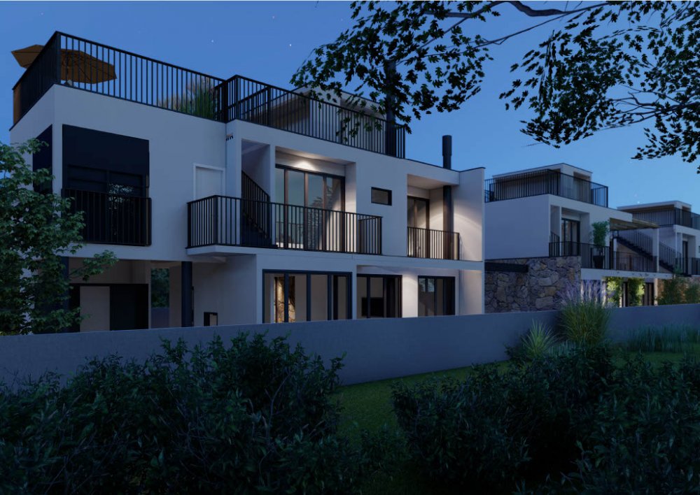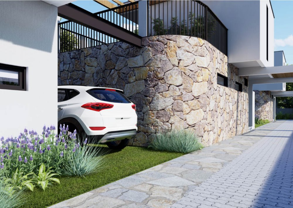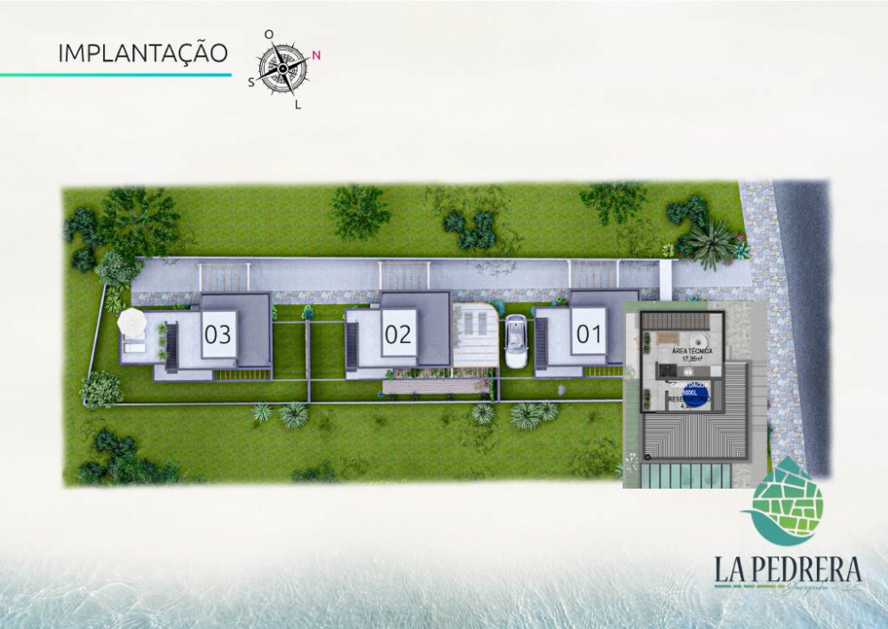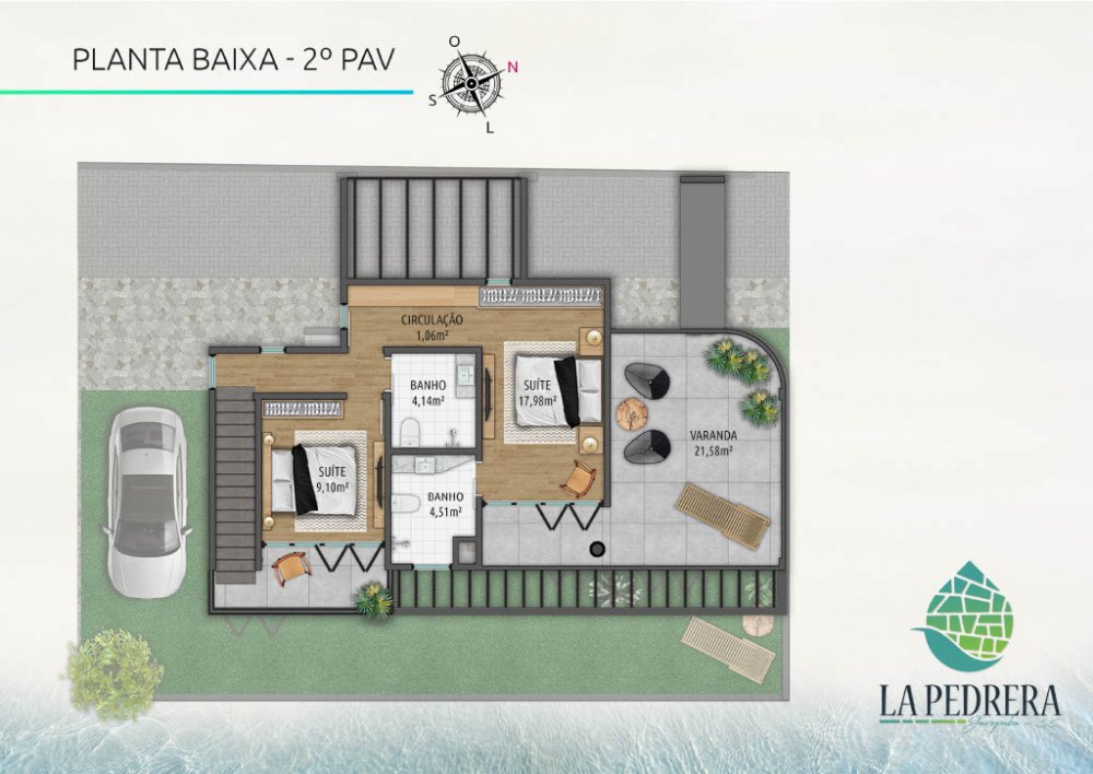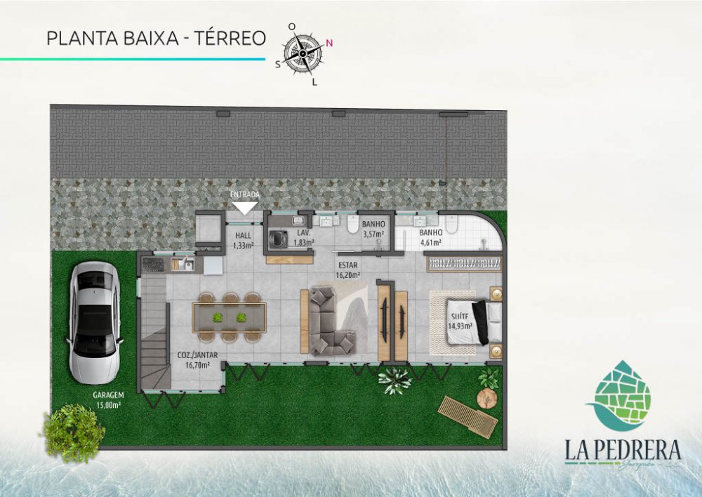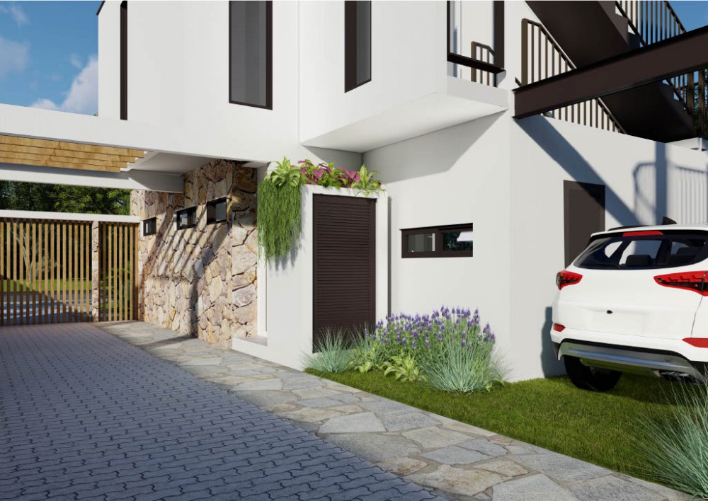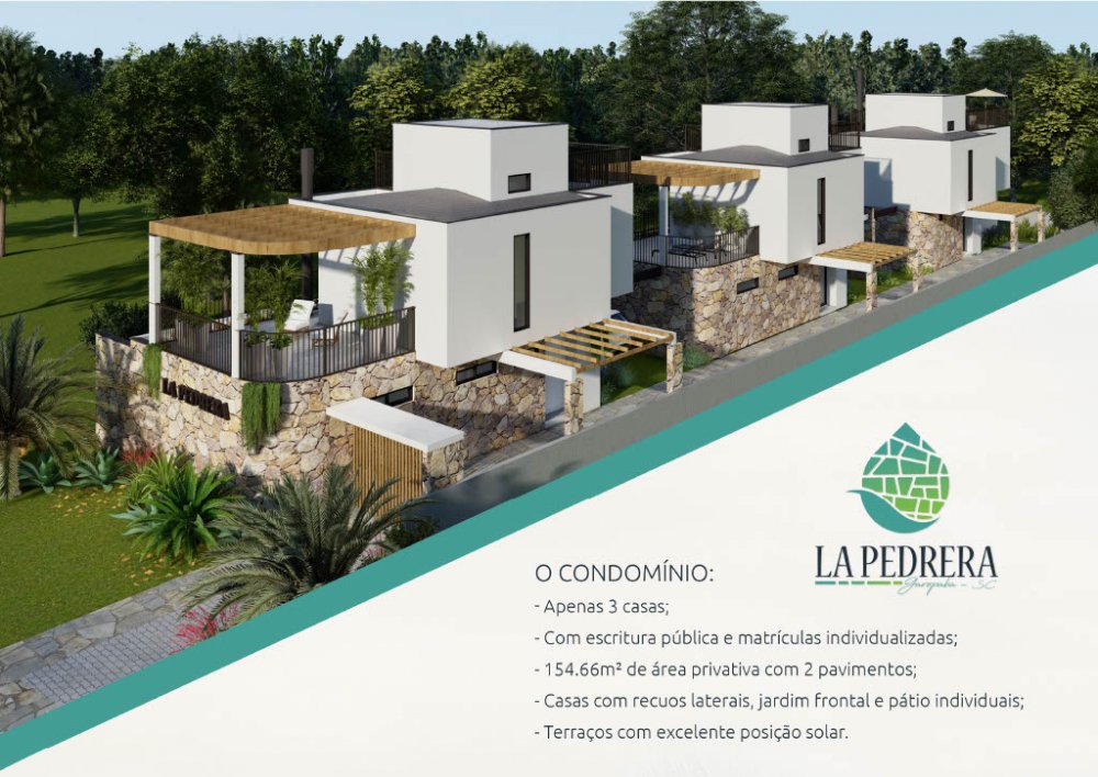 Com 154,66 m² de área privativa distribuídos em dois pavimentos, cada casa possui recuos laterais que proporcionam mais espaço e ventilação, além de um jardim frontal que valoriza a estética e a convivência ao ar livre. Os pátios individuais oferecem uma ótima opção para lazer e relaxamento, enquanto os terraços bem posicionados aproveitam a incidência solar, tornando os ambientes mais agradáveis.