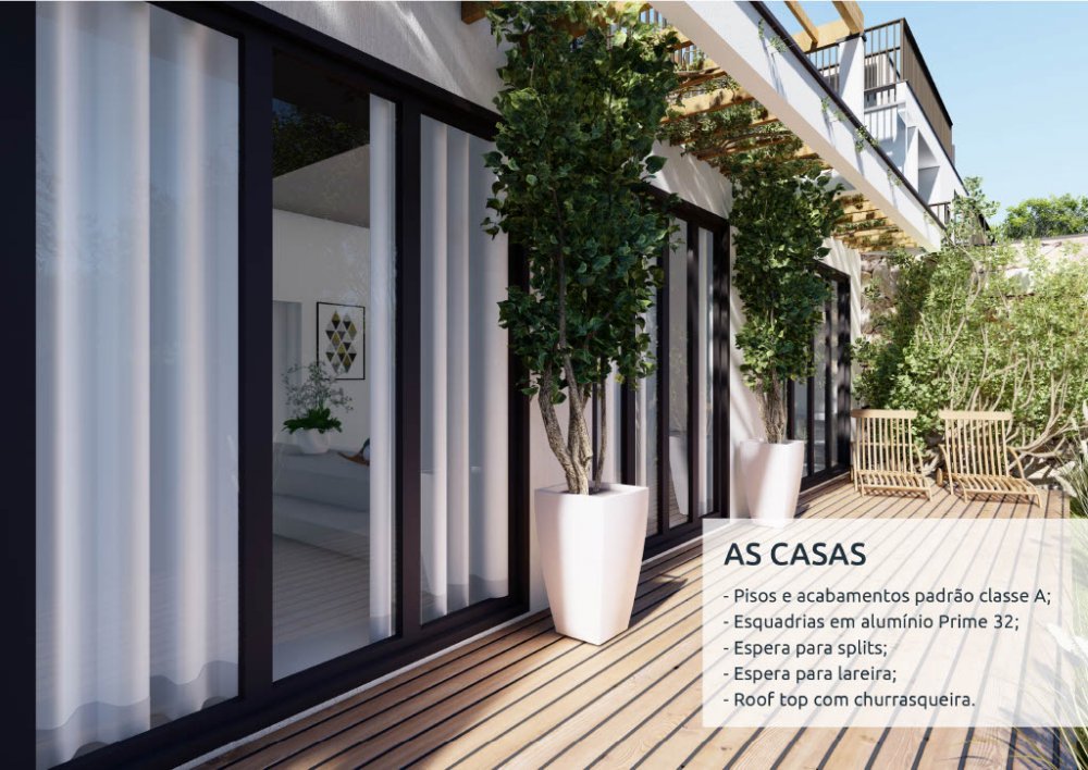 Os acabamentos em padrão classe A e os pisos de qualidade asseguram durabilidade e estilo, enquanto as esquadrias em alumínio garantem segurança e isolamento acústico. A presença de infraestrutura para a instalação de ar-condicionado (espera para splits) e lareira, além do rooftop com churrasqueira, são diferenciais que elevam ainda mais o conforto e a funcionalidade das casas.