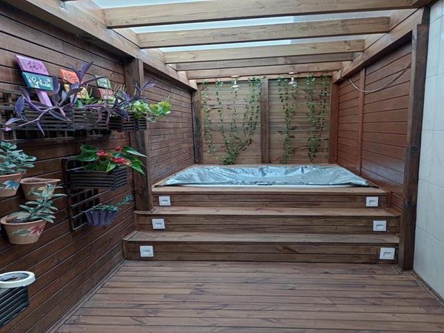 O pátio é todo murado e conta com uma Área Gourmet com churrasqueira. Além disso, há um spar aquecido com ozônio terapia, que proporciona momentos de relaxamento.