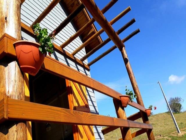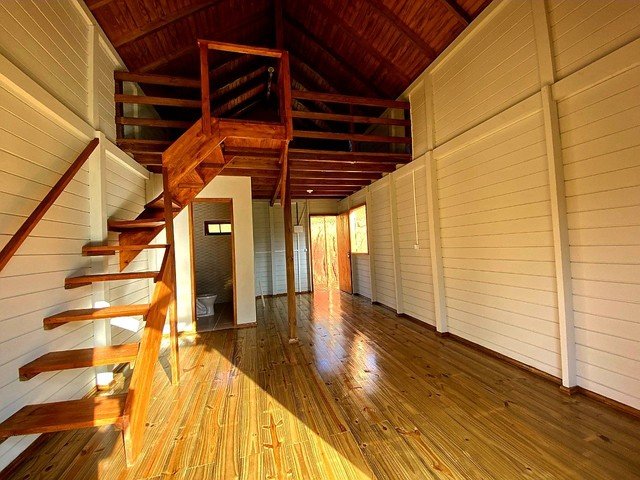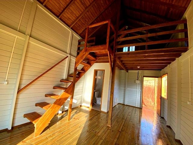 Chalé aconchegante com mezanino, medindo 54 m², feito em madeira de reflorestamento tratada em autoclave, garantindo durabilidade e sustentabilidade.